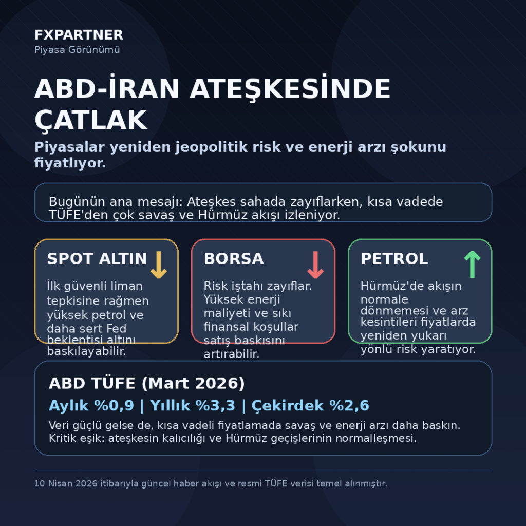 Özetle; bugün masadaki ana hikâye enflasyon verisinin tek başına ne söylediği değil, savaşın enerji üzerinden bütün fiyatlama setini nasıl yeniden şekillendirdiği. ABD-İran hattında ateşkesin güven vermediği, Hürmüz’ün tam açılmadığı ve bölgesel saldırı riskinin sürdüğü bir denklemde petrol yeniden yukarı dönmeye aday. Buna karşılık daha uzun süre yüksek faiz ve daha zayıf büyüme ihtimali, hem spot altın hem de hisse piyasaları üzerinde baskı yaratıyor. Piyasa tam da bunu fiyatlıyor: barış beklentisini değil, barışın bozulma ihtimalini.